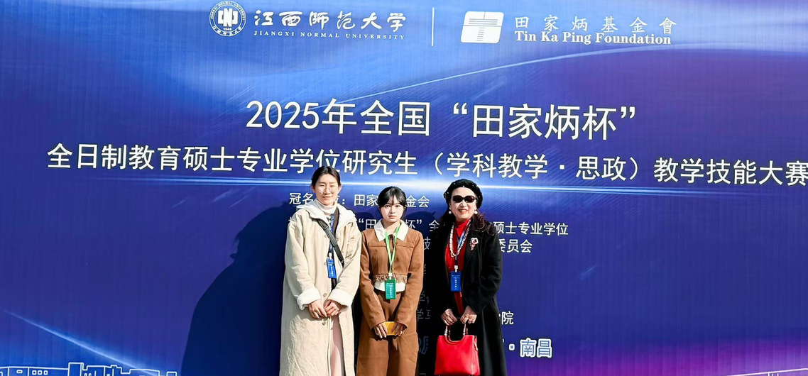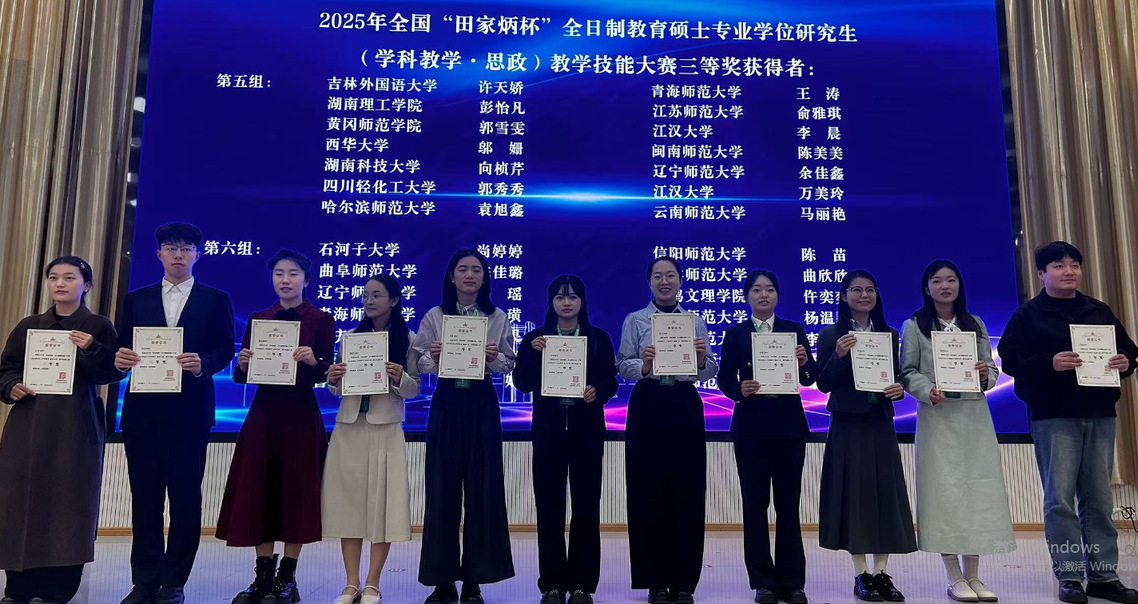 12月5日至7日,2025年全国“田家炳杯”全日制教育硕士专业学位研究生(学科教学·思政)教学技能大赛决赛暨人才培养高峰论坛在江西师范大学举行。来自华东师范大学、华中师范大学等90余所院校250余名选手参加决赛,我校马克思主义学院2023级学科教学(思政)专业硕士研究生郭秀秀荣获决赛三等奖。