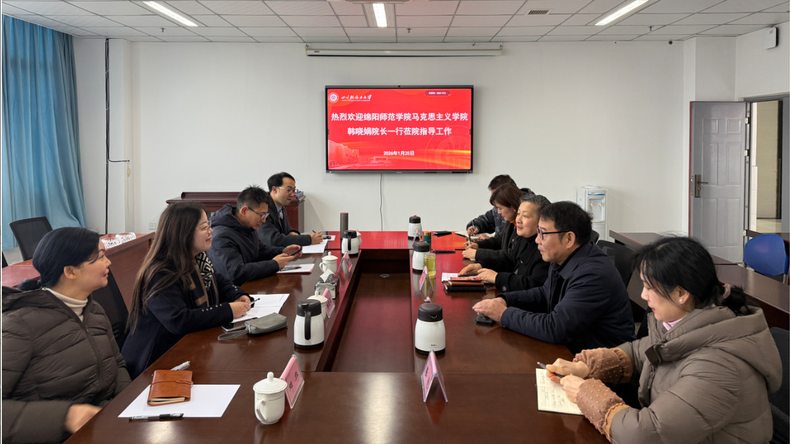 1月25日,绵阳师范学院马克思主义学院院长韩晓娟、副院长唐辉、教科办主任邓啟刚、思政专业教研室主任邓华一行来我院调研交流。我院党委书记王建琼、院长范光杰、党委副书记李香等相关负责人参加座谈会。