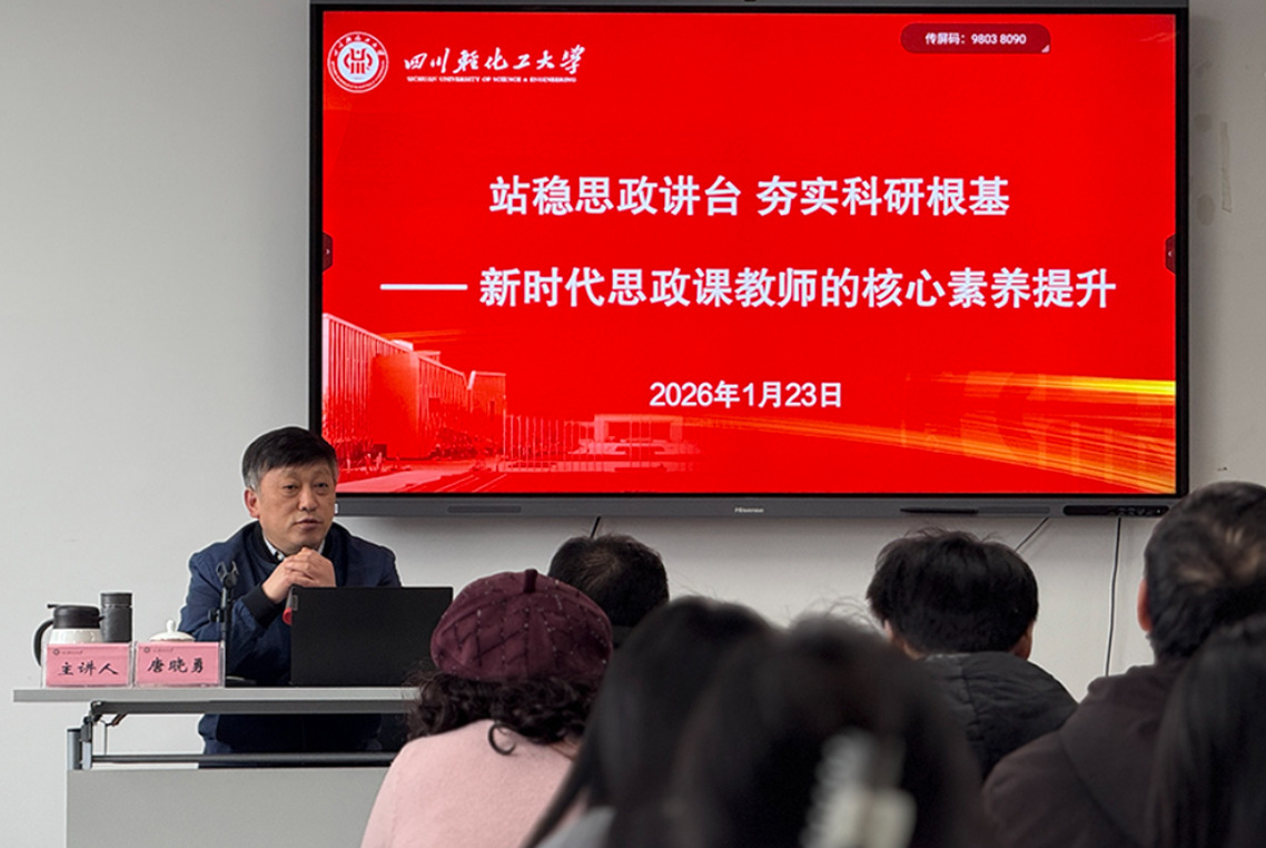 1月23日下午,四川省教学名师、教育部思政课教指委专家、西南财经大学二级教授唐晓勇在我校马克思主义学院举行“站稳思政讲台 夯实科研根基——新时代思政课教师的核心素养提升”专题讲座。讲座由马克思主义学院院长范光杰主持,学院班子成员及全体教师听讲。