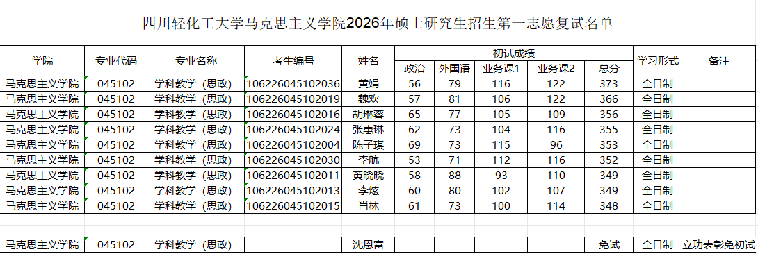 四川轻化工大学马克思主义学院2026年第一志愿复试名单