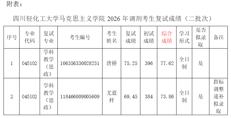 经我院研究生招生复试录取工作领导小组会议研究确定:根据我院招生计划,按复试合格考生综合成绩由高分到低分排序确定拟录取考生2名。请拟录取考生按学校《四川轻化工大学2026年硕士研究生复试录取工作安排》要求进行体检,并将体检表从即日起一周内邮寄给学院。